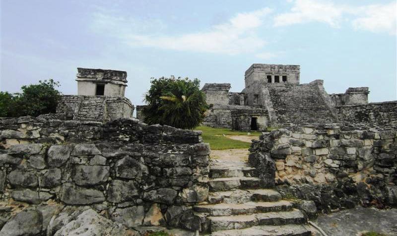 Entramos en la zona arqueológica de Tulum, sin saber mucho con que nos íbamos a encontrar. La verdad es que las ruinas no son tan impactantes como las de Chichen Itza, pero el paisaje es hermoso. Las ruinas están al lado del mar y el color del agua es turquesa.