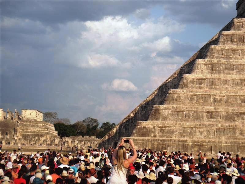 Era un día súper especial en Chichen Itza. El día del equinoccio, en este caso era el de primavera. El sol proyecta una sombra en las escaleras que forma 7 triángulos. Ésta sombra se creía que era una serpiente, el dios Kukulcán, que bajaba del templo. En la parte baja del templo, la sombra se une con una cabeza de serpiente construida en piedra. Estuvimos como una hora esperando para el momento justo donde la forma de serpiente es perfecta y se une a la cabeza, pero cuando faltaba poco, el cielo se nubló y la sombra desapareció. La verdad no me pareció nada del otro mundo. Estaba lleno de gente el lugar, todos esperando por ese fenómeno. Pero es lo mismo visitarlo en cualquier momento del año, no es algo que valga la pena.